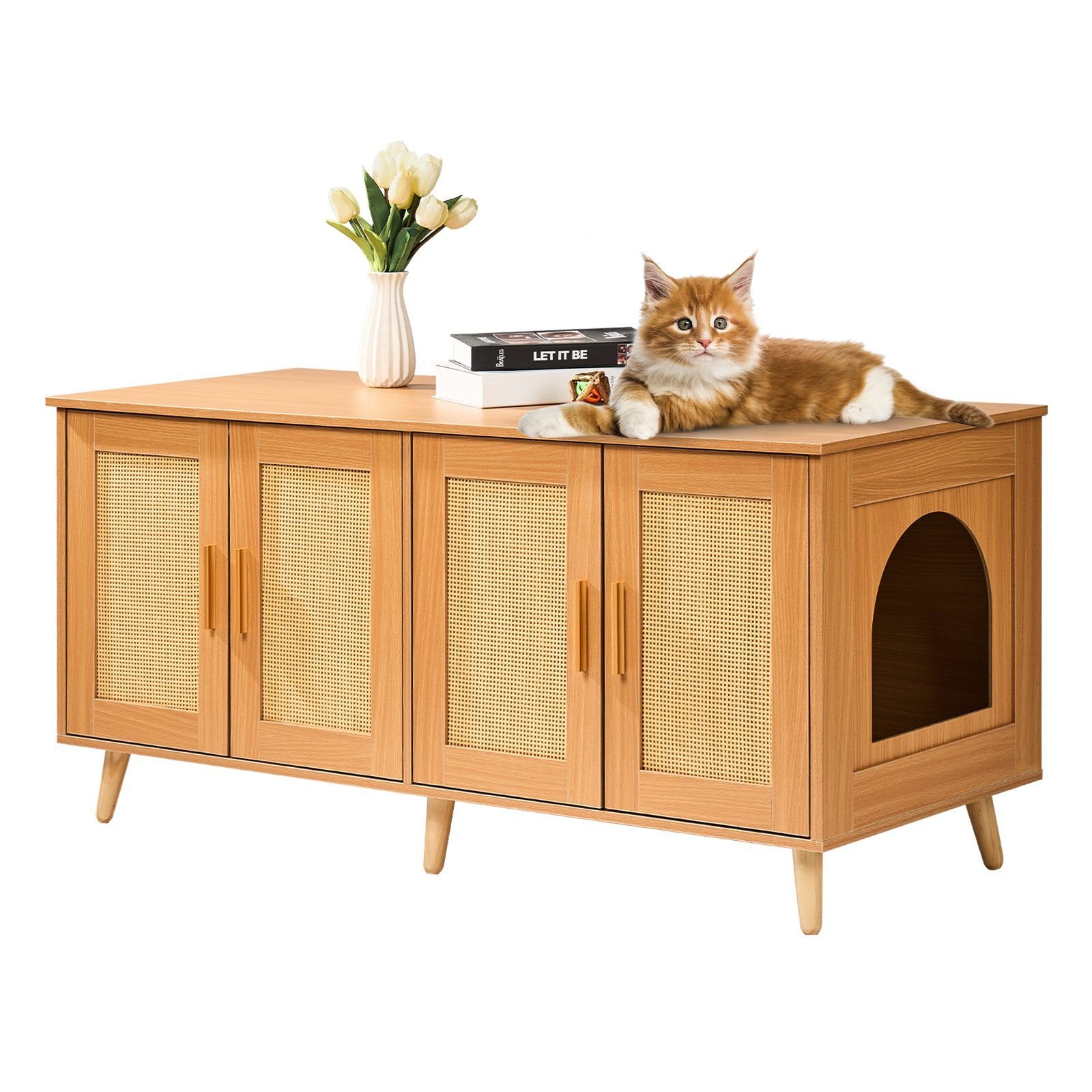 1.Hidden Aesthetic Design: The modern cabinet with rattan doors not only provides private space for your pet but also makes your room look neater. The wooden cat litter box enclosure can hide the cat litter box, perfectly matching the home decoration. Adopting a high-quality aluminum alloy handle, with a magnetic suction door, the opening is easy and smooth.
