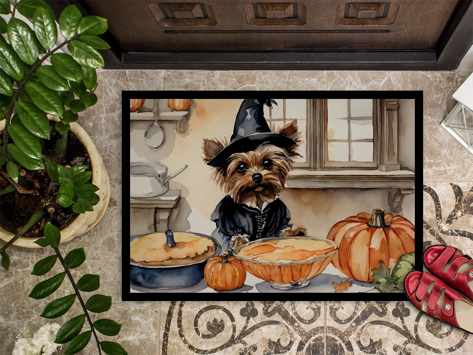 Doormat featuring breed specific Yorkshire Terrier artwork. Celebrate Halloween with this Halloween Doormat. Welcome your guests in style with our Artwork Door Mat, designed to withstand almost any weather condition. This mat, measuring approximately 24 by 36 inches, is held together by durable black binding tape. Its top layer, composed of polyester felt, is dyed with the eye-catching image you see on the mat. A few layers below provide the mat with stability, while its rubber bottom is stamped to help prevent slipping and ensures safety. Our mat works wonderfully as both an indoor or outdoor door mat. For cleaning, simply hose it off with water or use a power washer - no need for any cleaner that produces suds. Avoid scrubbing with a brush, instead, opt for the vacuum on floor setting. Designed manufactured and printed in the USA, this mat is a perfect addition to your porch, outdoor kitchen, entryway, or any indoor space. Its unique design makes it a charming decorative rug that greets your guests and adds a stylish touch to your home decor.