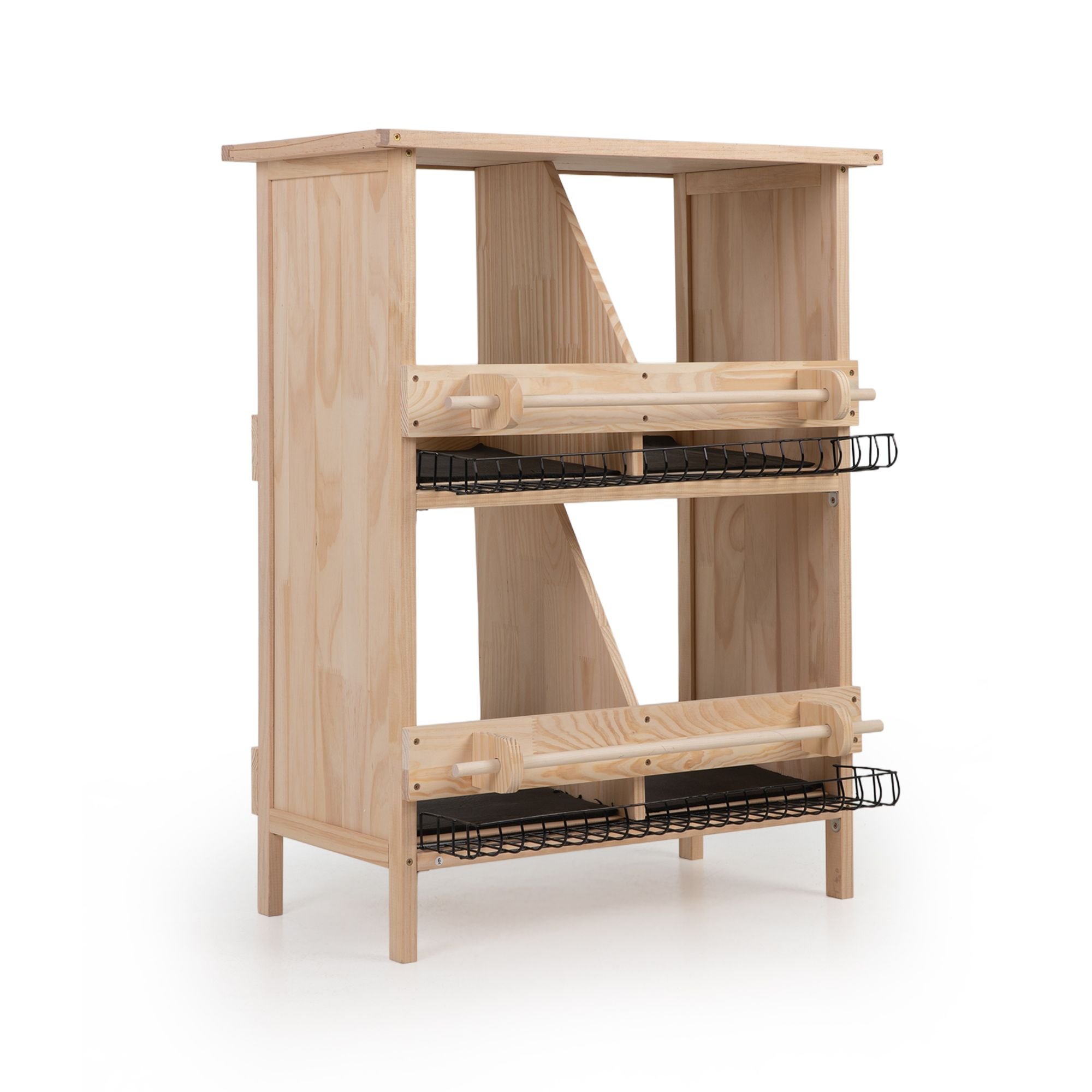 [Inclined Bottom Board]: In order to let eggs drop into the iron mesh in the front easily, the bottom board on each tier is elevated on the back to make it inclined.