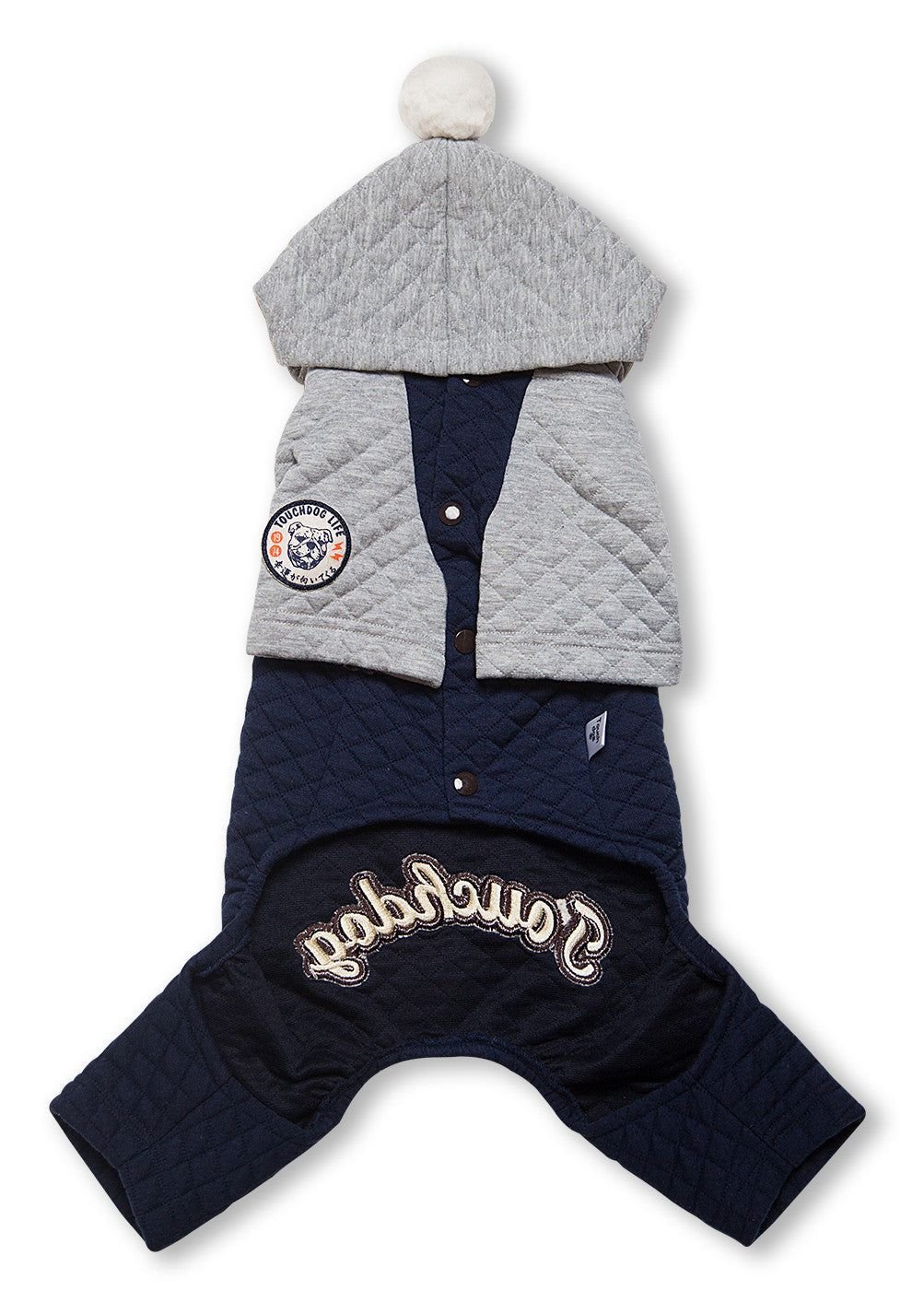 The Touchdog Quilt Hooded full bodied jumpsuit sweater is composed of quilted cotton and polyester blended shell. Hood features a nice accented Pom-Pom at the top with accented embroidered details along the back with a leash slit by the neck area. Machine washable. Available in Multiple Colors and Sizes.