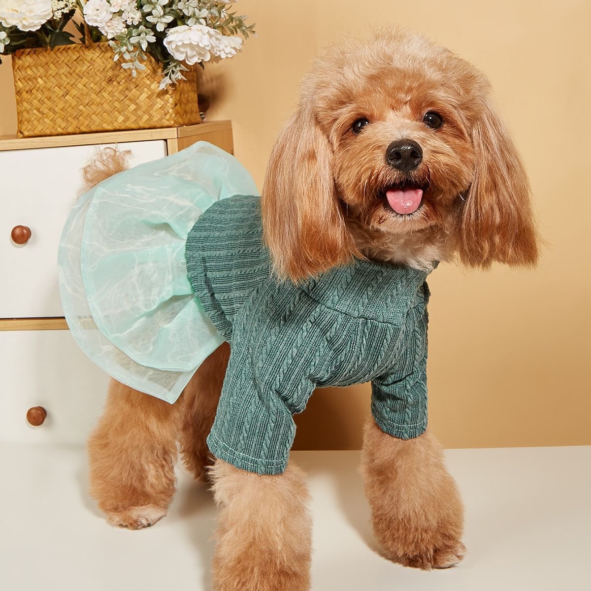 Small & Medium Dogs Solid Color Twist Knit Turtleneck Spliced Mesh Skirt; warm Dog Sweater For Winter Small & Medium Dogs Solid Color Twist Knit Turtleneck Spliced Mesh Skirt; warm Dog Sweater For Winter Small & Medium Dogs Solid Color Twist Knit Turtleneck Spliced Mesh Skirt; warm Dog Sweater For Winter